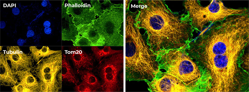 Красители: DAPI (синий), GFAP-488 (зеленый), Lectin-562 (желтый), GABA-647 (красный)
